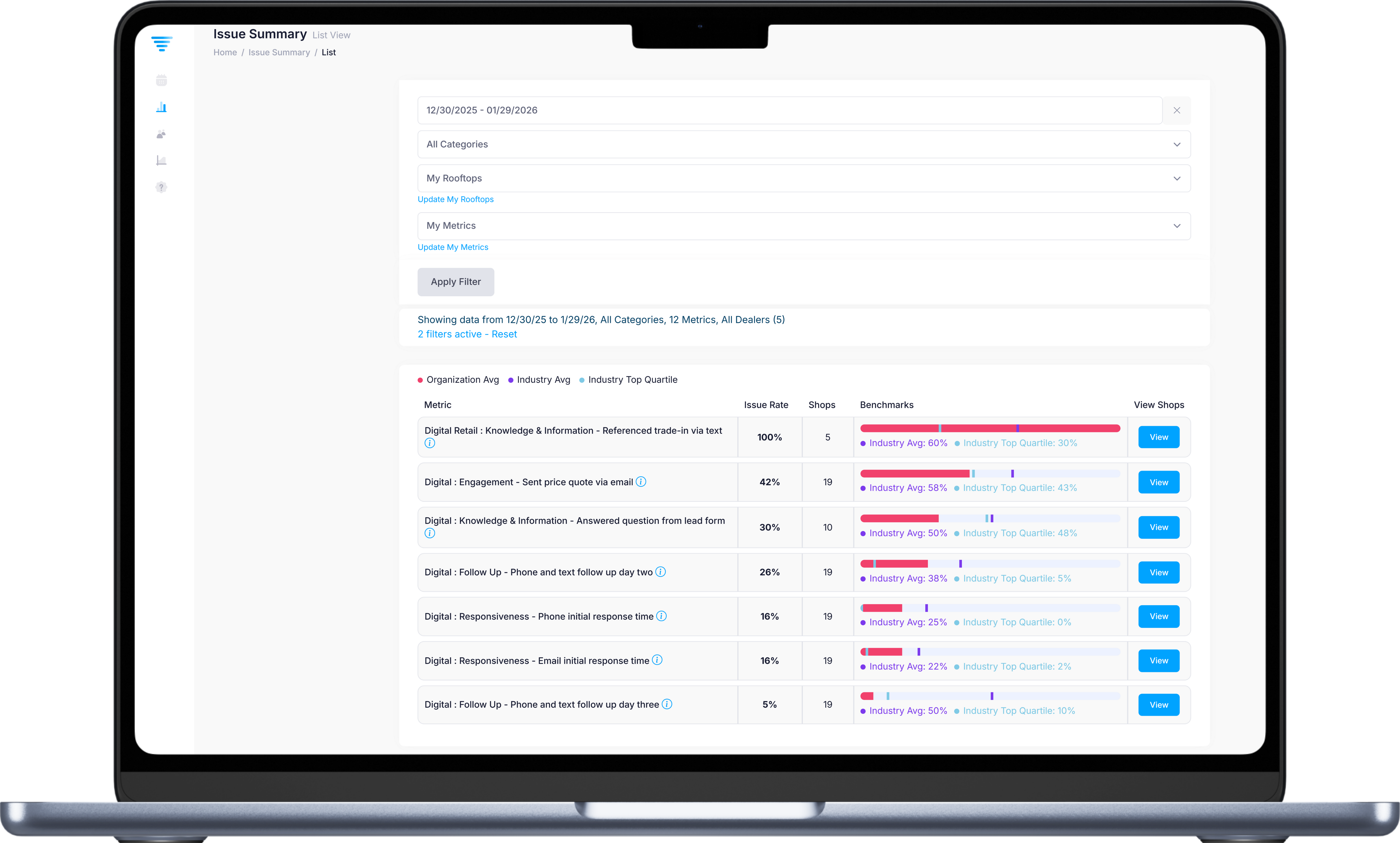 Network-wide mystery shopping and analytics, with benchmarking, trend tracking, and visibility across dealer networks.