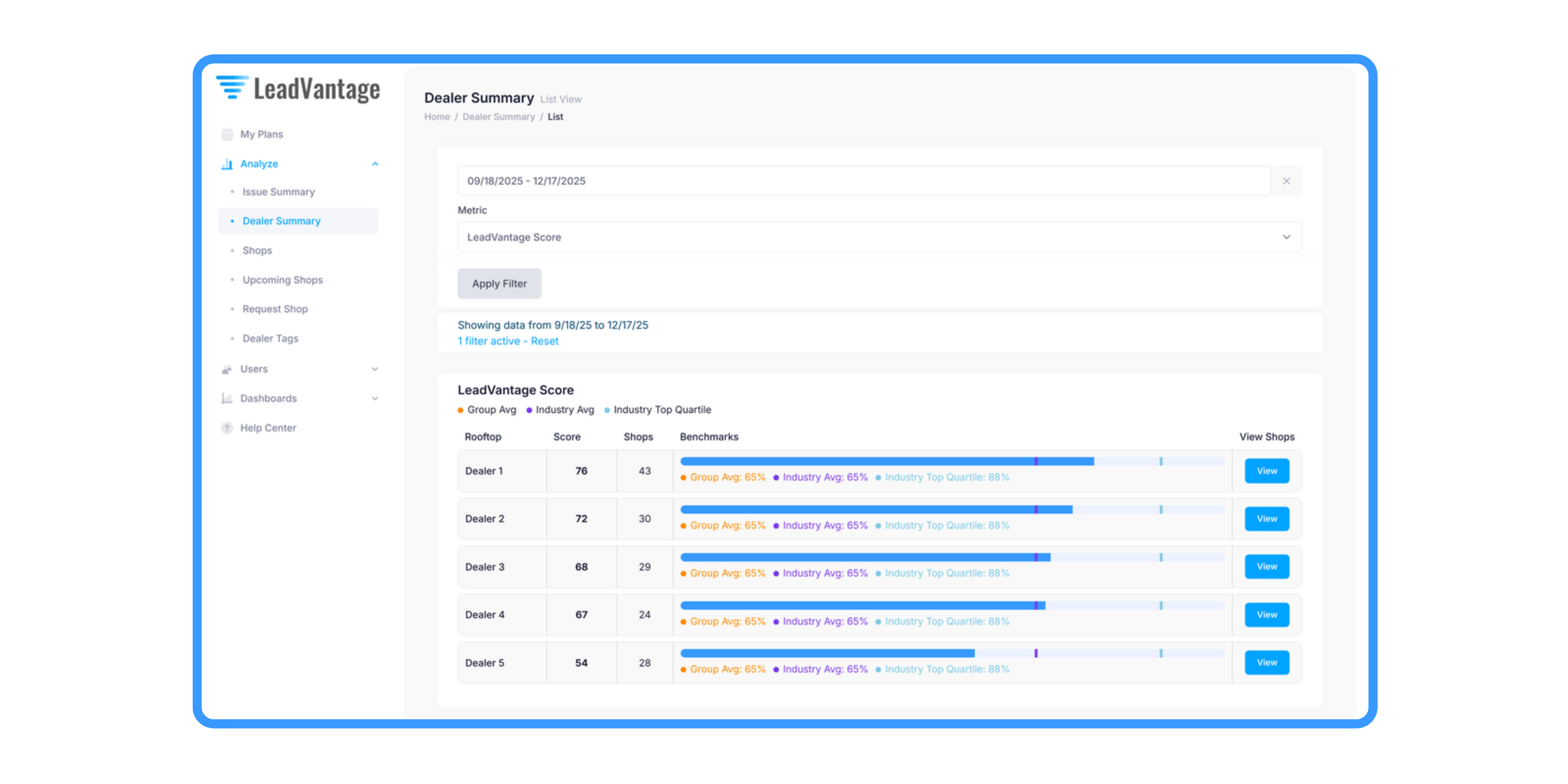 The LeadVantage Dealer Summary Report is designed to give dealer groups true visibility across every rooftop in their organization. Instead of looking at isolated performance metrics, leadership teams can view dealership performance in context.